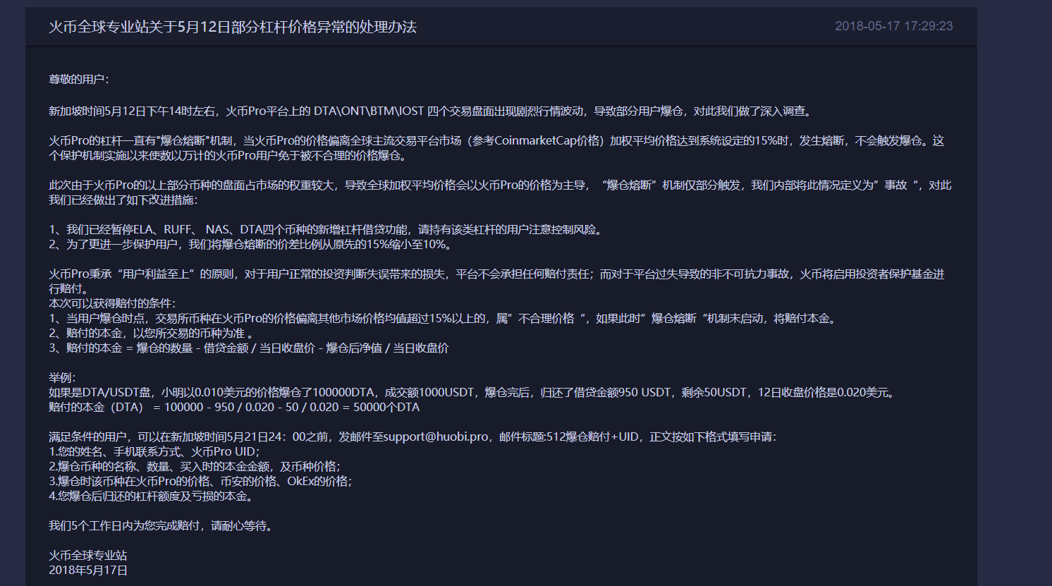 但17日晚间,火币网对外公布了5·12杠杆价格异常处理方案,承认当天确有技术事故发生。公告表示,5·12当天,因币种价格与其他平台币价超15%以上且“爆仓熔断”机制未启动而导致爆仓的用户,可进行邮件申诉,火币将在审核后赔付本金。