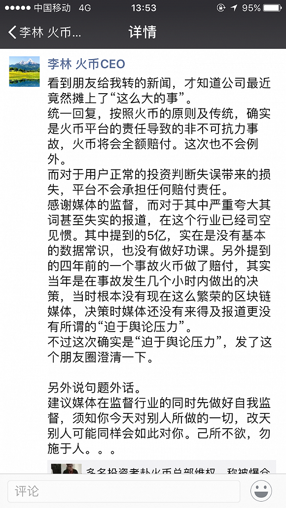 火币网CEO李林对此回应称:确实是火币平台的责任导致的事故,火币将全额赔付,而对于用户正常投资判断失误带来的损失,平台不会承担任何赔付责任。