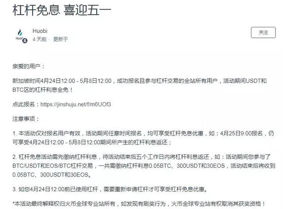 让投资者心底更加怀疑的是,在爆仓事件发生前不久的4月底,火币才推出杠杆免息活动,鼓励全站杠杆交易用户申请杠杆。