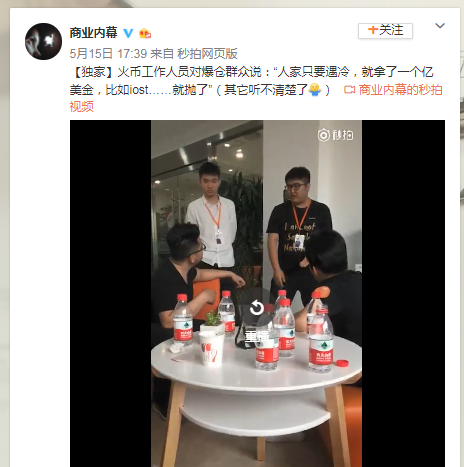 据微博“商业内幕”视频爆料,有部分投资者与5月15日到达火币网北京分部进行沟通。微博曝光视频中,火币工作人员对爆仓群众说:“人家只要遇冷,就拿了一个亿美金,比如iost……就抛了”。